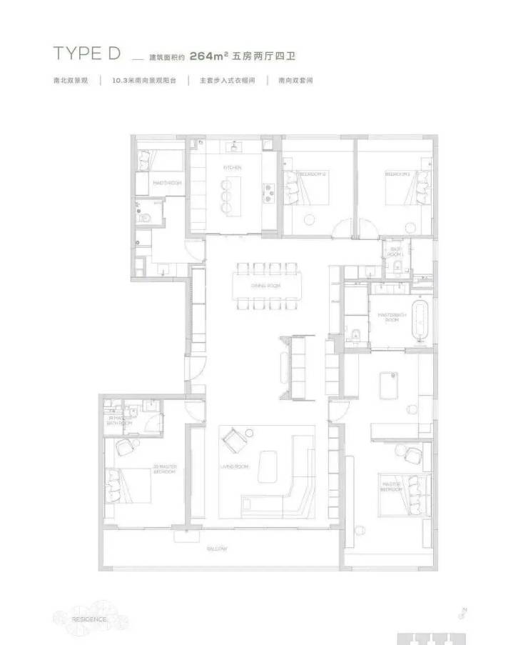 264为五房两厅四卫产品,更细腻的产品设计,超奢华四件套南向主卧,标准南向次主卧, 6.6米巨型方厅,纵向超长LDK一体化空间,专属家政保姆空间,超大容量收纳空间,令居住的尊贵从每处品质细节里流露而出,创造独一无二的奢享体验。
