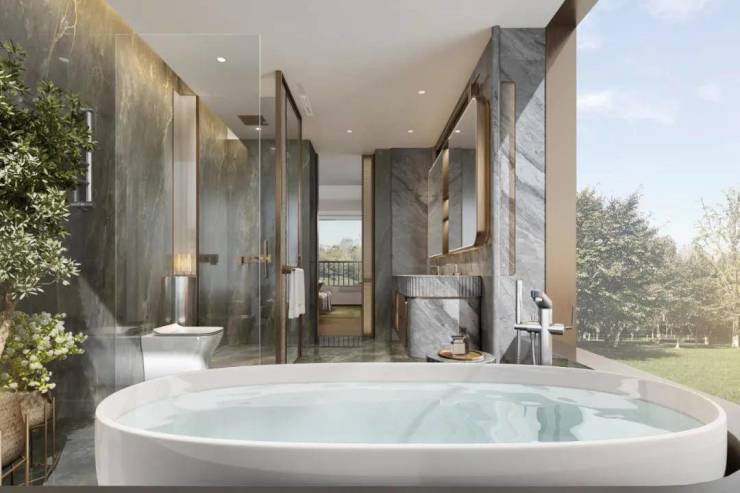 主卧做到了约36㎡,浴缸也直接升级到约1.7米,还配上美妆冰箱,呵护贵妇们的优雅。