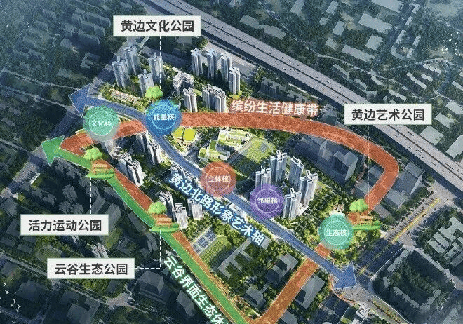 项目紧邻黄边艺术公园,未来将与黄边文化公园、活力运动公园、云谷生态公园四大主题公园相串联,形成自然与人文共生的活力空间。