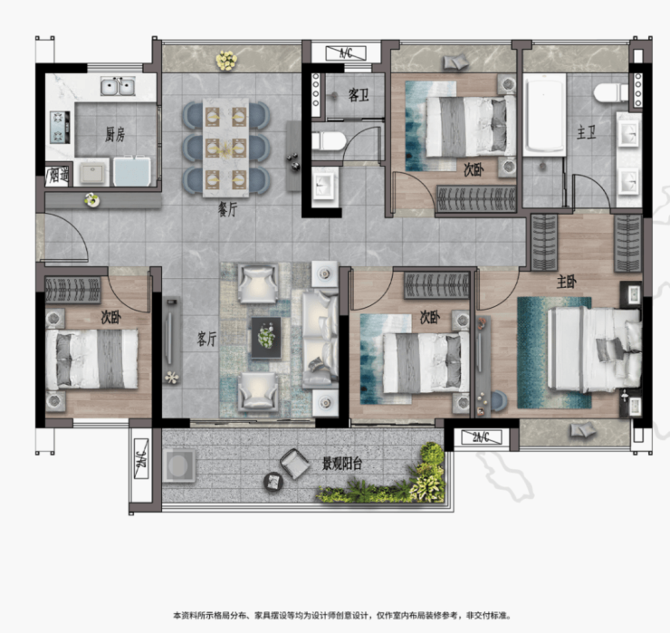 约三房带主套+望江/望园林+约3.3m开间阔厅