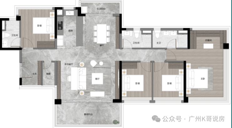 建面约123平四房,卧室都可放下1.8米大床,体验感相当于144平大宅,品质感更高。