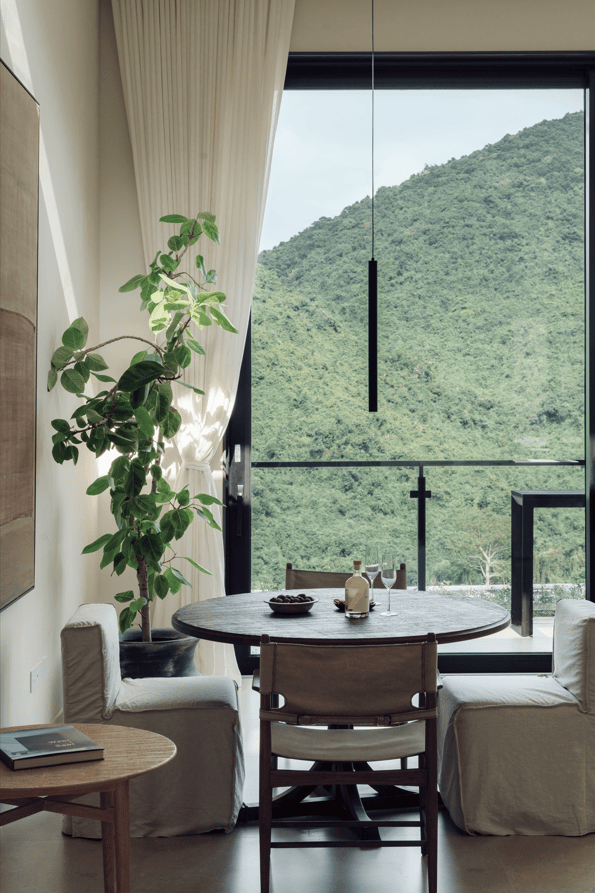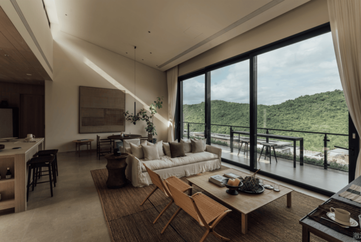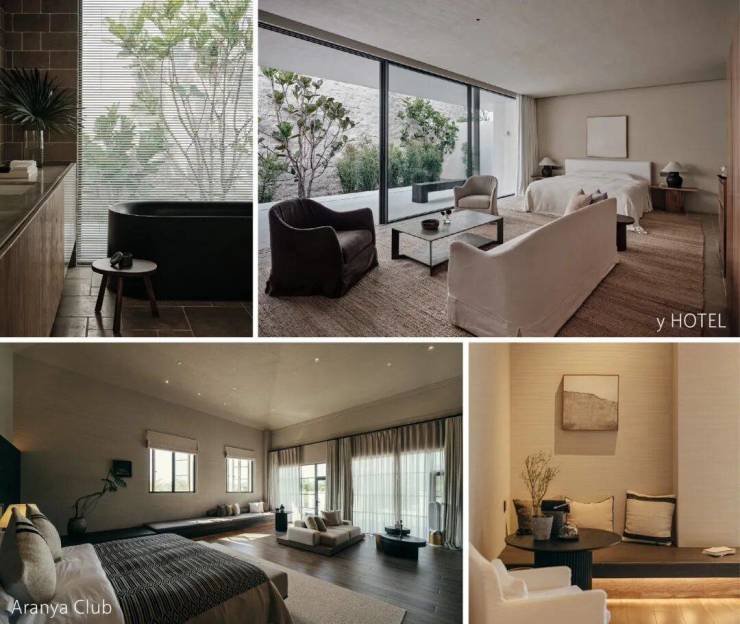 另一个值得说道的是“美学”,审美大家都在讲,但是阿那亚不一样的地方在于,它是一套从里到外的系统打法:产品上,用侘寂风、沙生植物、现代极简主义等,打造出区别于三亚传统度假盘的独特颜值和质感;