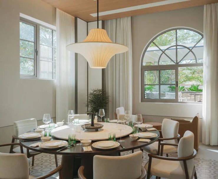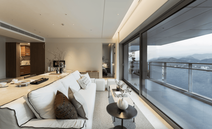 主力户型拥有约7.4m宽阔横厅,空间布局并不是常见的沙发面对电视墙,而是沙发直面落地窗外的景观。