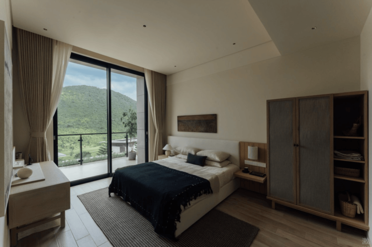 室内浅色装修风格则与室外形成巨大反差,极具度假的松弛感。这里包含约133㎡和169㎡两种户型,约133㎡户型可俯瞰山景,私密性绝佳;而约169㎡的主力户型,则面向开敞的山谷,中心景观“大草坪”视野绝佳。