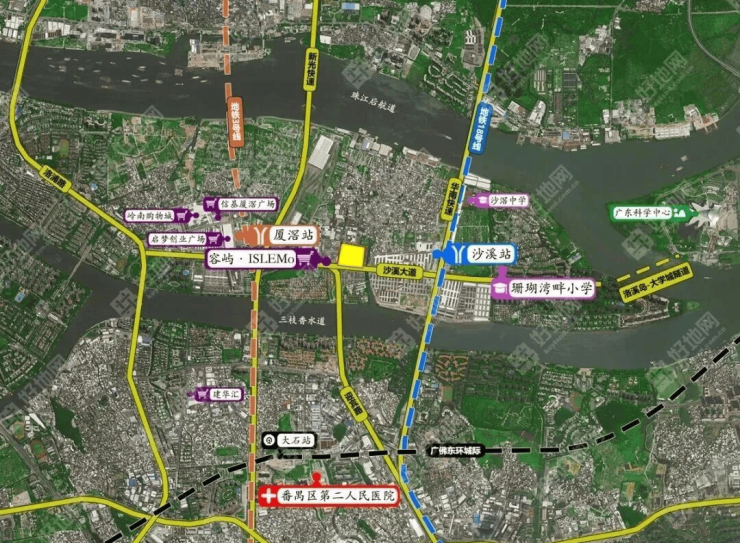 项目距离地铁18号线沙溪站约700米,3号线厦滘站约1公里,18号线可快速直达珠江新城、琶洲等核心区域。