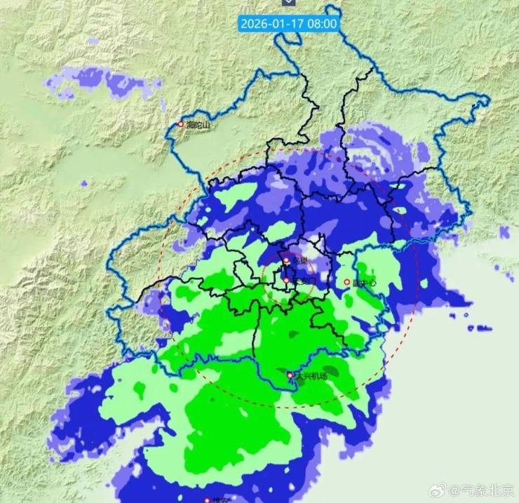 1月17日8时,据@气象北京 消息,今天早晨受偏东风影响,北京西部、南部出现零星小雪或小雪。