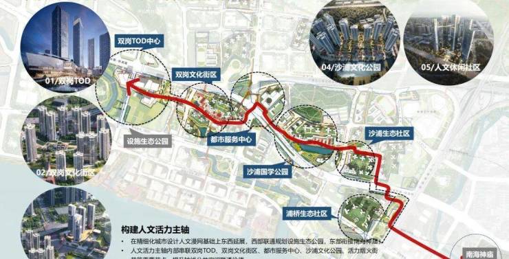 西至设施生态公园,东联南海神庙,构建串联TOD商业、文化街区、都市服务、生态社区等重点项目的漫游活力轴,重点塑造“双岗TOD中心、都市服务中心”两大综合商业地标及“双岗、沙涌”两大休闲文化街区,目前双岗TOD中心已确认引入华润万象系商业运营。