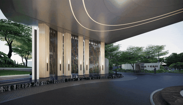 加之挺拔的灿金门头、大气的斜飘罗汉松、寓意高升的典雅台阶,再以水景点缀,尊崇感铺面而来。