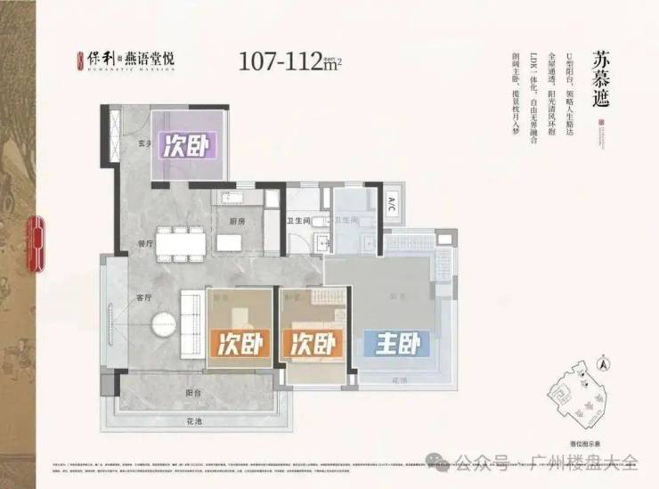 建面约110㎡四房。这个户型是东南向,有利有弊。最强四房。其LDK一体化大横厅,尺度直追海珠140㎡+的产品。但同时,它又平衡了卧室的尺度,每个卧室均有舒适的休息、收纳与活动空间,保证均好性。