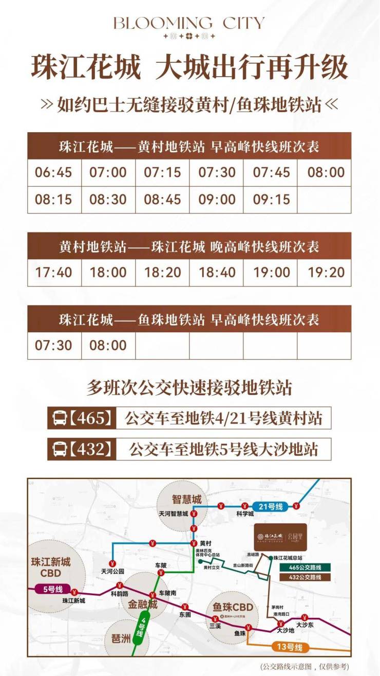 目前已开通465/432线路,无缝接驳地铁站。【465路】接驳地铁4/21号线黄村站【432路】接驳地铁5号线大沙地站。现在珠江花城如约巴士地铁专线已开通3条路线运营!黄村站地铁专线早晚高峰期加密班次(早高峰15分钟一班、晚高峰20分钟一班)。