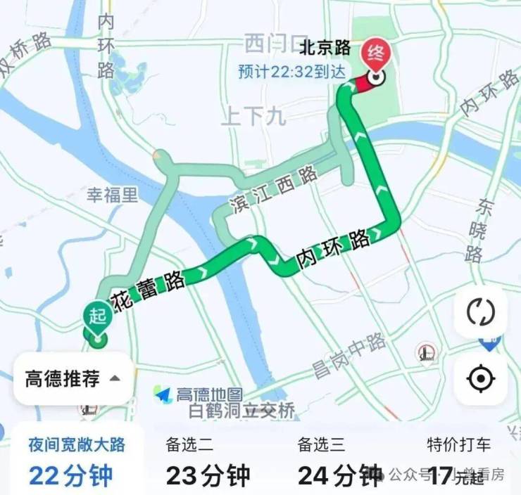 自驾去北京路:出小区上花蕾路转洲头咀隧道,再上内环至江南大道,全程8.4公里,耗时22分钟,这是不堵车的情况下,上下班内环会堵车,通勤时间会拉长。