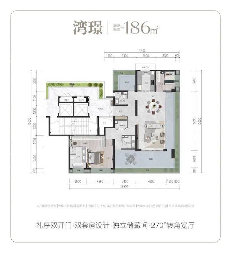 建面186㎡湾璟户型:礼序双开门设计,双套房布局搭配独立储藏间,270°转角宽厅尽显奢阔,满足高端旅居需求。