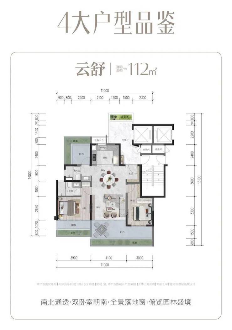 建面112㎡云舒户型:南北通透,双卧室朝南搭配全景落地窗,俯览园林盛境,空间利用率高,适合三口之家旅居。