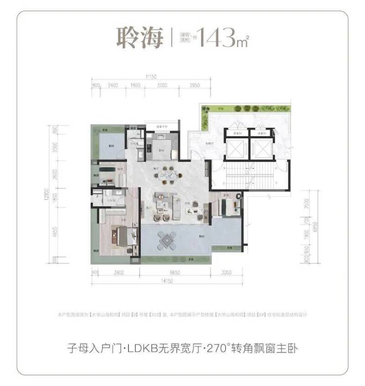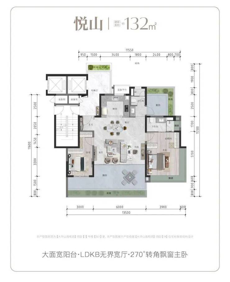 建面132㎡悦山户型:LDKB无界宽厅设计,大面宽阳台延伸生活空间,主卧270°转角飘窗,最大化吸纳山海景观。