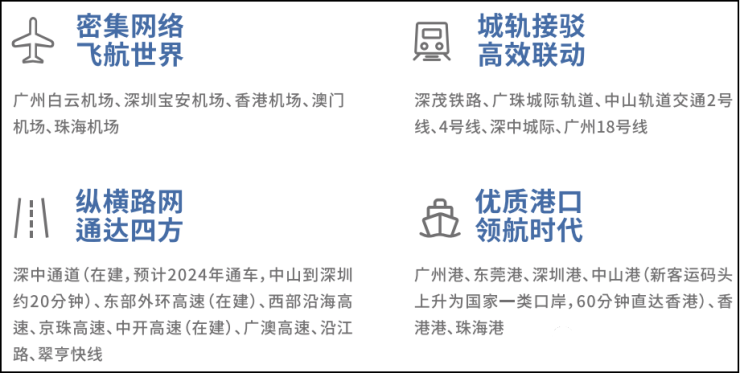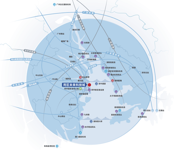 湾区未来科技城坐拥"一桥一港双站六轨道四快线"海陆空立体交通路网,1小时可通达珠三角5大国际机场和6大港口,深中通道约20分钟迅达前海,距深圳宝安机场仅约30分钟。只有交通便利,才有物流、人流的通畅,进而形成产业经济的综合效应。中山因其特殊的中心位置,“1小时圈”的物理距离具有非常大的优势,再加上深中通道的开通,将更加巩固中山作为湾区枢纽城市的地位,为企业提供更便利的物流通道和更低的物流成本。