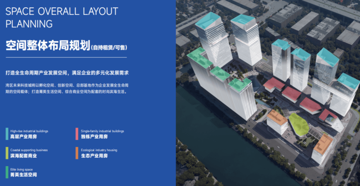 湾区未来科技城是中山首个新型产业用地(M0)落地试点项目。项目占地面积约113亩,规划总建筑面积约38万平方米,计容面积约30万平方米,总投资额约27亿元人民币,拥有约21万平方米产业用房,约9万平方米菁英生活空间和滨海配套商业,涵盖全生命周期企业产业用房集群和配套生活空间。