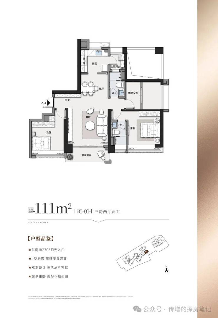 建面约111㎡三房两厅两卫精致3房设计,南北对流改善一步到位,东南向270°阳光入户,约4.2米景观阳台,约3.5米主卧开间 乐享144方主卧同等朗阔空间