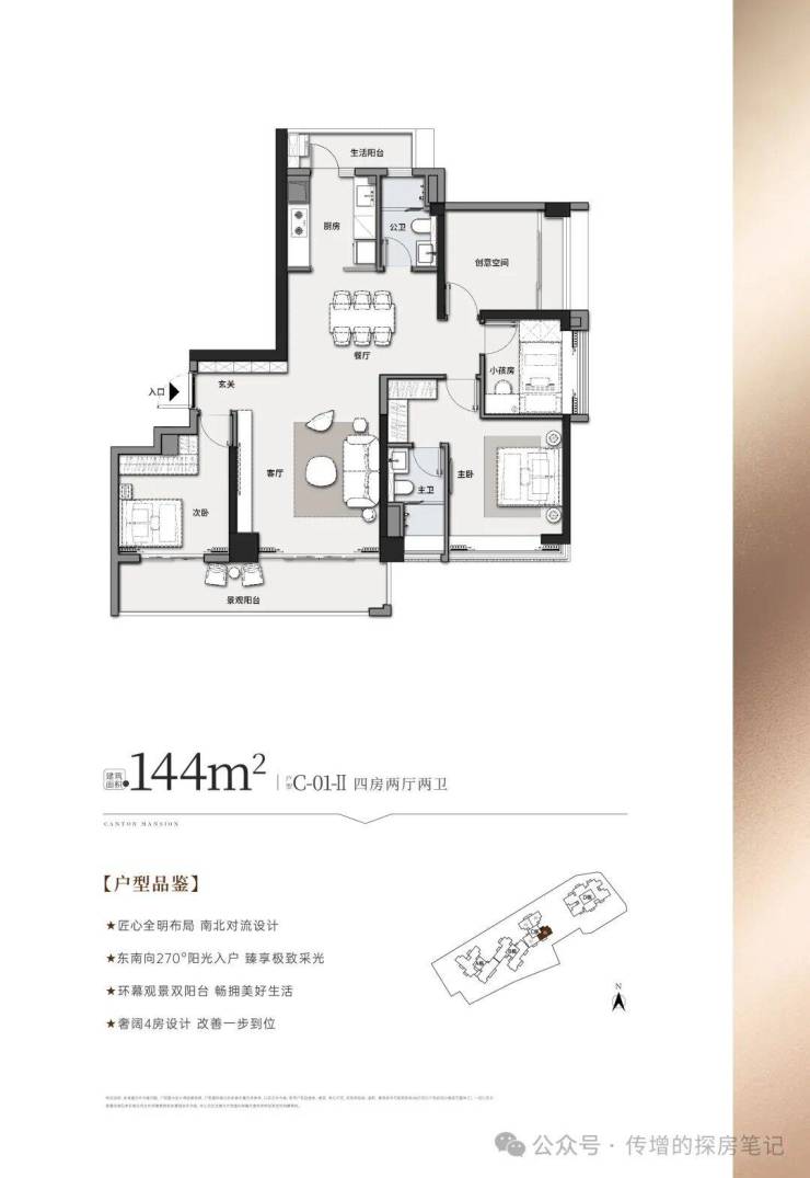 建面约144㎡四房两厅两卫市中心稀缺南北双阳台对流户型,7.5m阔尺阳台,LDK客餐一体化,改善首选,东南向270°阳光入户,四季皆是明朗光景