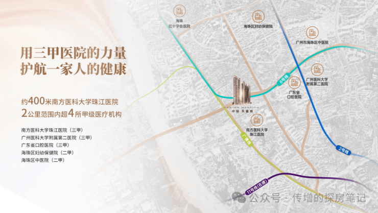 500米步行南方医科大学珠江医院,广州医科大学附属第二医院、广州市红十字会医院、广东省口腔医院等多家三甲医院保驾护航。