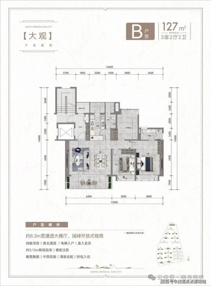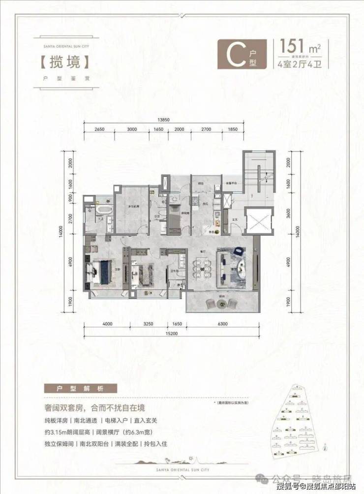 项目首期开发三亚·东方太阳城|山河苑」约10万㎡,由17栋洋房和3栋平墅组成,绿化率约40%,演绎一城生态人居典范。户型建面约约105-192㎡三至五室栖心洋房,一梯两户,户户南北通透,全屋采光观景,70年产权住宅,精装修拎包入住。