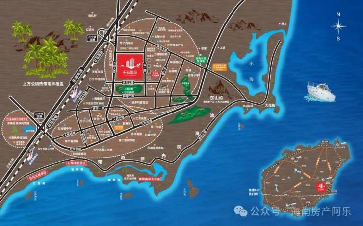 千弘国际位于海南省万宁市万州大道仙泉时代广场东南侧,由九坤企业管理集团旗下海南千弘血液技术有限公司开发,项目占地21亩(约1.4万平方米),总建筑面积3.2万平方米,容积率2.0,绿化率35%,建筑密度23%,产权年限40年,精装交付,物业费3.5元/㎡/月。