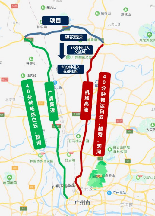 项目交通篇多维立体交通,出行便捷项目南侧为山前旅游大道,距肇花高速六花岗出口仅600米,无缝接驳大广高速、机场高速、京港澳高速、广清高速等南北主干线。15分钟直达融创文旅城、广州东环城际,20分钟到白云国际机场,40分钟即达白云新城,50分钟可达珠江新城;享受珠三角一小时生活圈