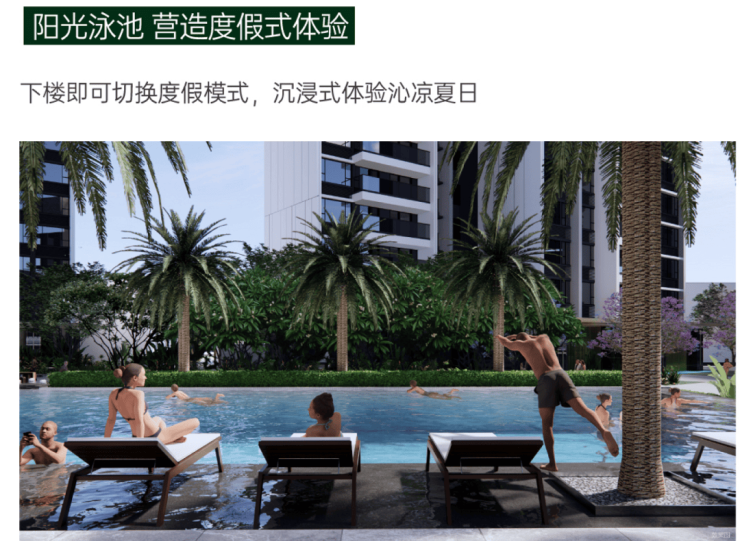 度假泳池:融合公园化自然体验,打造阳光泳池,水景黑金沙铺装相映成趣,叠水景观潺潺,景观躺椅营造度假式体验