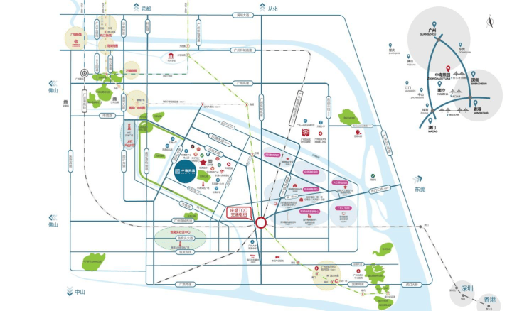 庆盛作为国家在大湾区规划发展纲的科技章节中唯一一个被提到的区域,未来将形成集交通、高精尖科技、教育、商服、医疗为一体的一个综合经济增长极 。