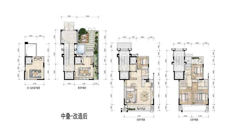 一层北向约35㎡花园及一间会客厅,四层餐客厅厨房及1间卧室,三层是休息区共有3间卧室。