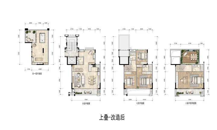 六层餐客厅厨房,七层是休息区共有3间卧室,八层整一层南北通透的大主卧,北有露台南有阳台。
