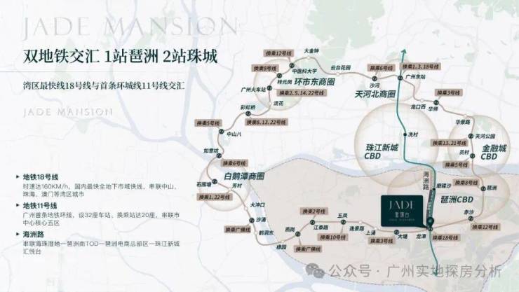 2、交通十分便捷:是地铁 11 号线和 18 号线双轨交汇处上盖的 TOD 项目,18 号线可快速到达广州南北各地,11 号线为环线,可便捷连接市内各重要区域,周边还有主干道四纵三横贯穿,15 分钟内可达琶洲、珠江新城等核心 CBD。