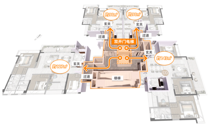户型方面做到类专梯入户,两梯四户梯户比+双开门电梯,类专梯专户的豪宅高标。