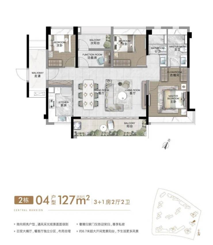 建面约127㎡4房2厅2卫(横厅)四开间南向采光,约13.2m超长南向采光面,豪华主卧套房,超大270°转角飘窗。