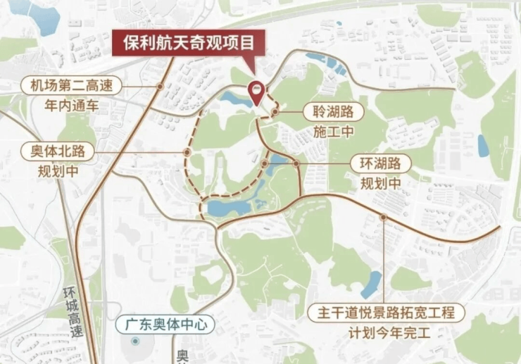 项目周边生态环境比较好,地块东南侧有一条短短的直路,可以步行到日月双湖、越秀观樾。