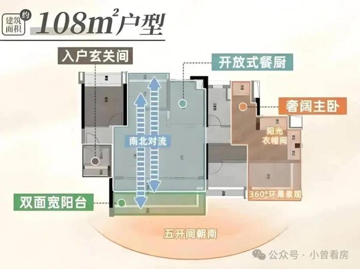 108㎡左右的四房户型主打南北对流,且实现了五开间朝南,客餐厨空间衔接流畅,U 型厨房预留了足够的操作台面,部分房源还能拓展出实用空间,总价约 610-680 万,满足成长型家庭的居住需求。