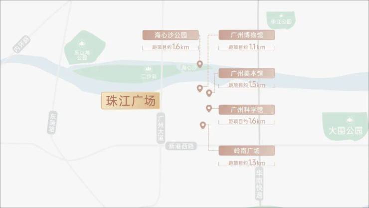 尽享岭南广场(约1.3公里)、广州美术馆(约1.5公里)、广州科学馆(约1.6公里)、广州博物馆(约1.1公里)、海心沙公园(约1.6公里)等休闲配套,奢享文化休闲慢生活。