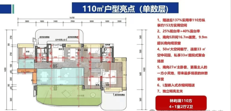 招商蛇口林屿境主打刚需、刚改买家,全盘只做建面约81平、110平和125平三款户型,套数共806套,2梯3户/5户。