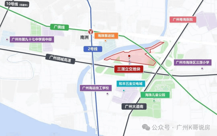 项目地块距离2号线和广佛线交汇的南洲站直线距离仅约400米,广州绕城高速和广州大道在项目旁交汇,位置可以说是“四通八达”,但因地块被不少主干道包围,自然避免不了噪音和粉尘的干扰。