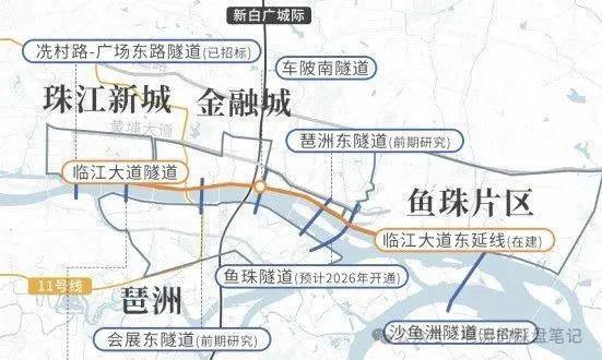 与此同时,新白广城际也将在今年开通,琶洲和金融城的距离将缩短成一个站。其实,去年开通的11号线,已经实现了这一点。未来,随着琶洲与鱼珠隧道,琶洲与珠江新城隧道的开通,一江两岸将被彻底缝合。