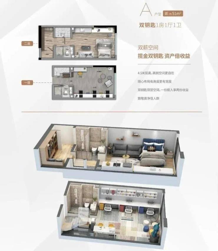 A户型建筑面积约51㎡,采用双钥匙设计,实现了资产双倍收益;