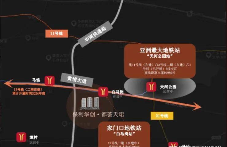 项目交通网络四通八达,三横三纵的主干道贯穿其间,无论是前往珠江新城、金融城还是其他城市热点区域,都能实现快速通行。同时,项目紧邻天河公园站和白马岗站两大地铁站,尤其是天河公园站作为三地铁交汇的枢纽站,未来出行将更加便捷高效。随着地铁11号线和13号线二期的建设推进,预计2024年底将正式开通,届时将进一步提升项目的交通优势。