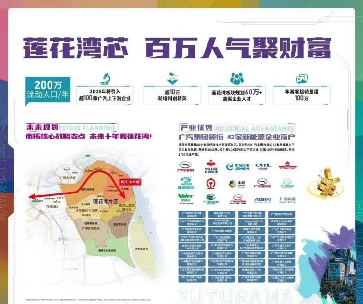 项目位于千亿汽车城板块核芯:周边以广汽集团领衔,已有42家新能源企业落户,2025年将超100家,汇聚10万+科创精英,60万+高薪企业人才。
