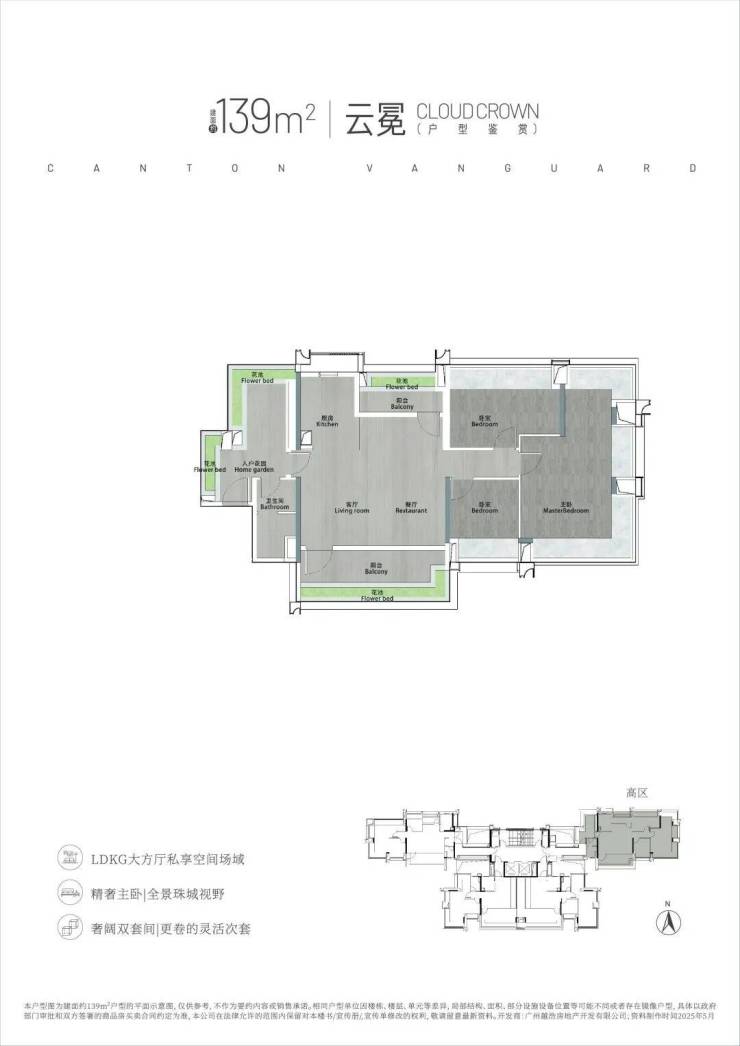 产品为70 年精装住宅,主推 99-139㎡四至五房,全南向设计、高实用率,户户通透采光。社区配 6 层配套与 7 层架空立体园林,含健身、阅读等多元空间。越秀物业一级服务(5.75 元 /㎡/ 月),以主城绝版地段、全优学区、创新户型,成为越秀高端改善的稀缺之选。