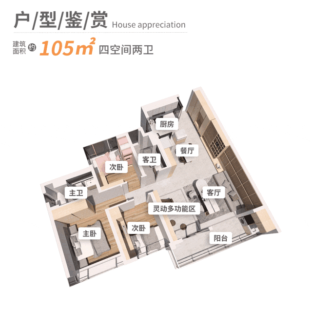 最后看建面约105㎡四空间两卫,则是二胎家庭的兴趣共享屋。
