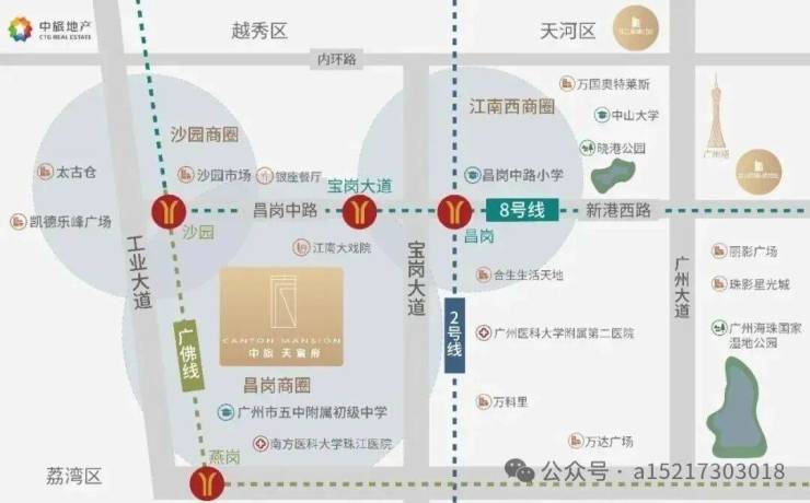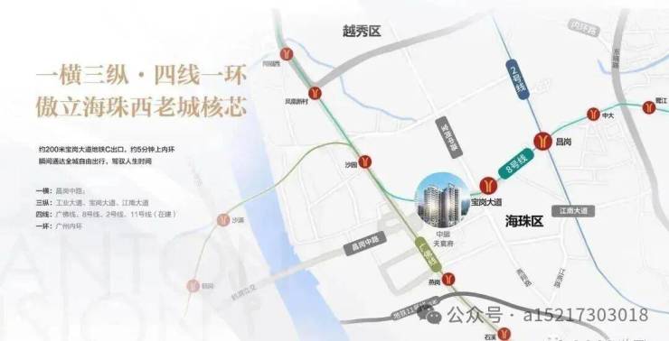 买房③要素,地段、地段、还是地段,项目位于海珠昌岗中路与宝岗大道交汇处,宝岗大道、工业大道、江南大道,海珠三大黄金走廊环绕。