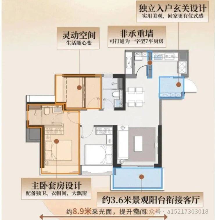 比如,采用少承重墙化设计,次卧可打通或隔开,生活阳台也能与厨房打通出7平全明空间。