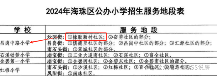 项目位于海珠区最强教育板块,根据广州市海珠区教育局政府信息公开网站,《2024年海珠区公办小学招生服务地段表》中显示,项目所属沙园街橡胶新村社区,直接对口省一级昌岗中路小学。
