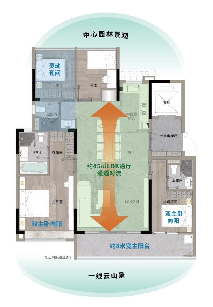 奢享约18.5米总开间,五开间向阳。约50㎡LDK一体化空间,搭配中西双厨,尽显风范;星级主套房配备双独立衣帽间及270°全景飘窗,尽览云山盛景,是追求多代同堂和乐生活的塔尖家庭优选。