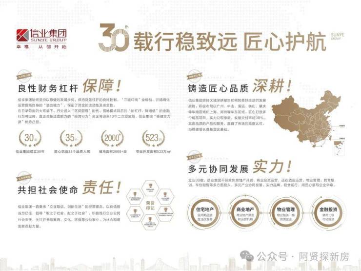 超30年实力品牌 匠心铸就生活范本信业集团,成立于1993年,前身为美心地产,立足于广州。辐射华南、华东区域城市。集团的发展战略以稳健为主,诚信经营,资金充足,企业推行多元化发展战略,以房地产为主,经营涵盖各大行业,逐渐成为大型化集团企业