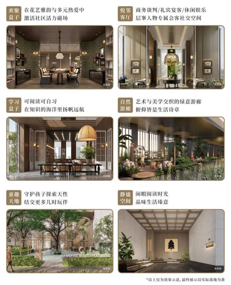 打造6大主题社区架空层空间,涵盖欢聚盒子、悦邻客厅、学习盒子、自然游廊、童趣天地及静谧空间等丰富功能体验,际会之交,美好相逢,致力让每位居者,都能找到心之所属。